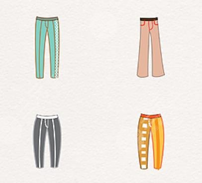 (1)選擇適合的褲型:建議胖人應選擇直筒型或略顯微喇的褲型,能夠使腿型顯得修長,并避免選擇太貼身或太寬松的款式。同時也應注意腰部設計,選擇中、高腰型,抑制膝部以上皮下脂肪的外突,使腿部線條更加優(yōu)美。
