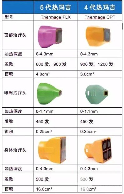 第5代熱瑪吉分為3個緩解頭,分別是三種顏色:紅色、黃色、綠色。三個顏色代表不同緩解,用于三個不同的地方。紅色是多緩解頭,有300發(fā)、600發(fā)和900發(fā)的,可用于面部到頸部這些部位;黃色的是身體的緩解頭,一般是500發(fā),主要在身體上使用;綠色的是眼部專用的緩解頭,一般標準是450發(fā),用于眼部周圍。