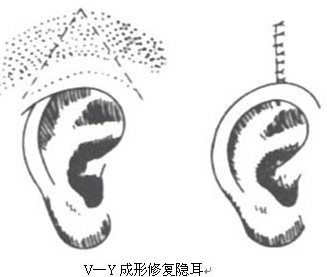 1、應(yīng)用局部皮瓣轉(zhuǎn)移的方法,應(yīng)用“V—Y”推進(jìn)皮瓣的方法,設(shè)計(jì)一個(gè)以耳廓上部為基底的三角形皮瓣;掀起此三角形皮瓣,剝離翻開(kāi)耳廓的粘連面,然后將三角形皮瓣向下后方折放于所形成的創(chuàng)面上,供瓣區(qū)的創(chuàng)面則在兩側(cè)潛行分離后直接拉攏縫合。