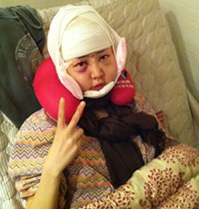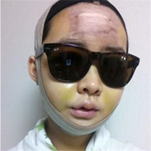 術后第二天:我做的項目比較多,不只是v-line整形手術,還有自體脂肪干x胞填充,第二天都腫得跟豬頭一樣,哈哈,我都不認識我了~~