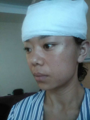 因?yàn)槲曳罴y,魚尾紋,臉部下垂嚴(yán)重,吳醫(yī)生首先給我進(jìn)行了手術(shù)提拉!手術(shù)中打的局麻,還好,手術(shù)一點(diǎn)都不疼,還是有一點(diǎn)點(diǎn)緊張的,只是在鬢角切了一個(gè)小口。好吧,手術(shù)之后我就變成了這個(gè)樣子,好像一個(gè)太婆啊……