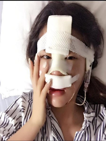 這個是第八天的,我已經(jīng)拆了線了,鼻子還是有單腫,眼睛看起來好多了,鼻子里那個是鼻夾,所以現(xiàn)在我的鼻頭,看起來還是那么大,豆瓣是撐的,現(xiàn)在還是沒有洗頭,難受想哭,以前基本每天都會洗頭的我,那種痛苦可想而知啊。