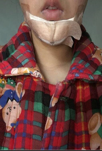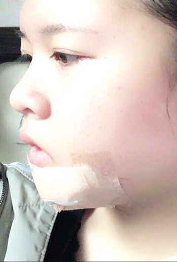 這個是手術(shù)后的第二天,下巴脹脹的,不是很舒服,但是還我是能忍受未來的幾天都不能洗臉,只能自己忍受了,難過的時候就用濕紙巾擦擦,這樣好受一點!