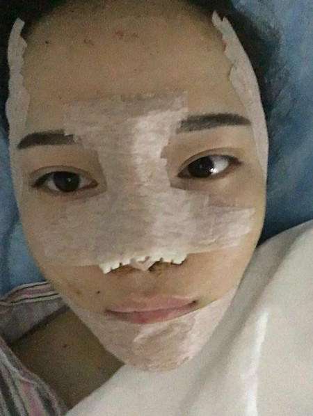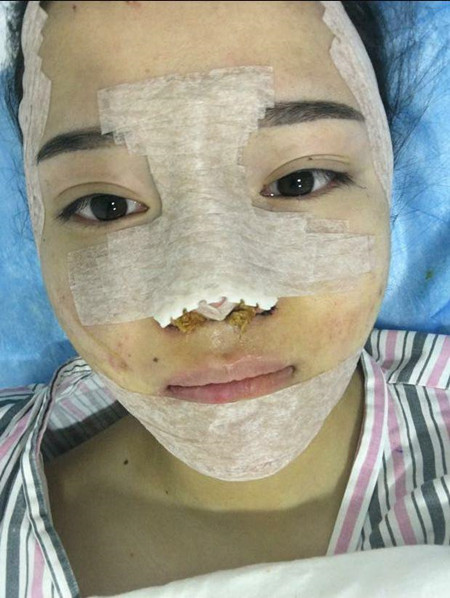 第留天咯,臉還是很腫,眼角有淤青,下巴很硬,鼻頭麻麻的沒(méi)有感覺(jué),鼻子也是腫的,頭發(fā)很油臉也很油再忍忍吧后天就可以拆線(xiàn)了,哎