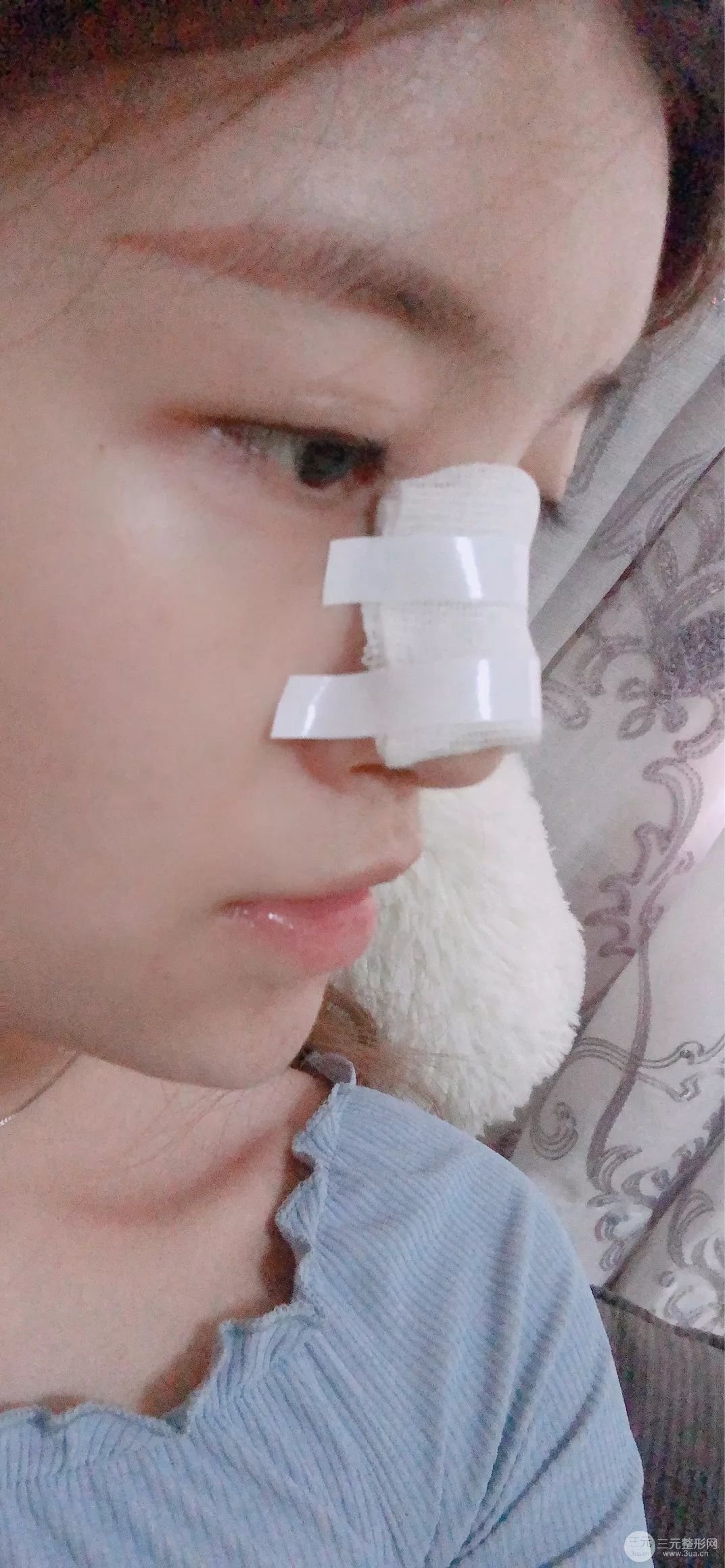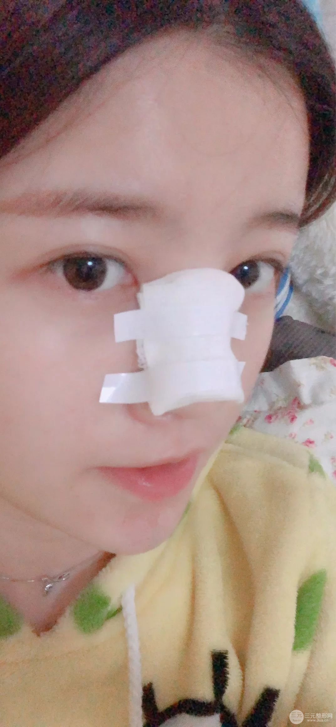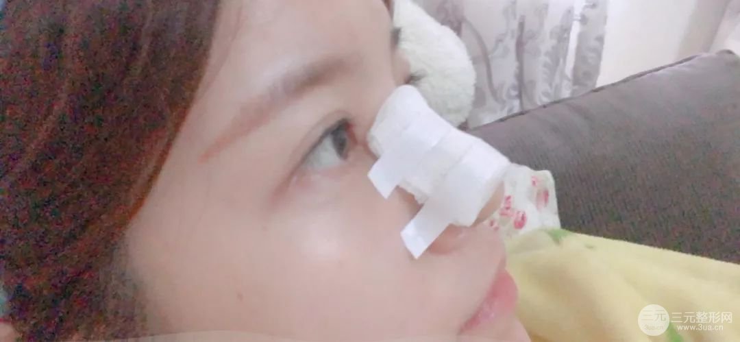 術后第二天,整個手術都沒有什么疼痛的問題,畢竟打了*藥嘛!術后第二天的時候整個鼻子都包著紗布,現(xiàn)在只有慢慢的等待蛻變過程了!